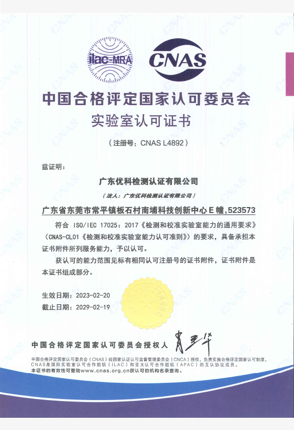 廣東優(yōu)科檢測認(rèn)證有限公司(簡稱:UKK)成?于2007年,是國內(nèi)專業(yè)的汽車整車及零部件、電子元器件第三方檢測實(shí)驗(yàn)室,國家級中小企業(yè)公共(技術(shù))服務(wù)示范平臺,獲得了國家?新技術(shù)企業(yè)、廣東省專精特新中小企業(yè)、市級工程技術(shù)研發(fā)中心等榮譽(yù)稱號。 More